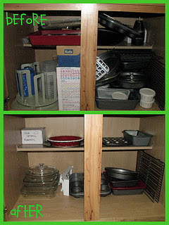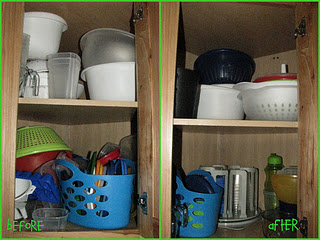A reader, Sandra, sent in her before and after photos when she tackled one of her kitchen cabinets. She said, "I tossed some things, moved others to a more useful shelf, and put the rest in the giveaway pile.