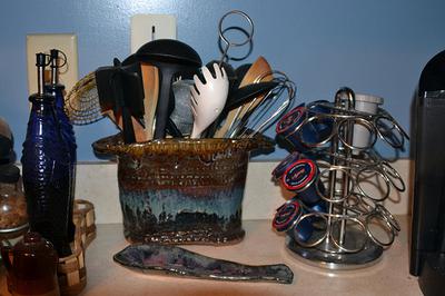 Another idea, if both drawer space and counter space is at a premium in your kitchen, is to hang an organizer on the wall which you can put large utensils and cooking implements on.